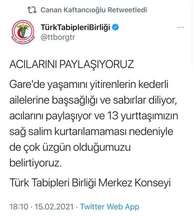 TTB sosyal medya hesabından şunları söylemişti: 'Acılarını paylaşıyoruz. Gara'de yaşamını yitirenlerin kederli ailelerine başsağlığı ve sabırlar diliyor, acılarını paylaşıyor ve 13 yurttaşımızın sağ salim kurtarılamaması nedeniyle de çok üzgün olduğumuzu belirtiyoruz. Türk Tabipleri Birliği Merkez Konseyi'