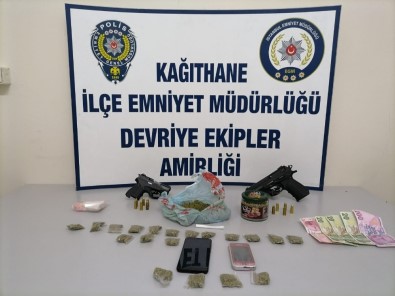 Kağıthane İlçe Emniyet Müdürlüğü ekiplerinin bir süredir peşinde oldukları iki torbacı tartıştıktan sonra güpegündüz sokakta havaya ateş açarak kaçtı. Şahısları takibe alan polis ekipleri aracına binecekleri esnada kıskıvrak yakaladı. Gözaltına alınan 2 şahsın üzerinde ve evinde yapılan aramalarda 2 adet tabanca ve çok miktarda “bonzai” ele geçirildi.