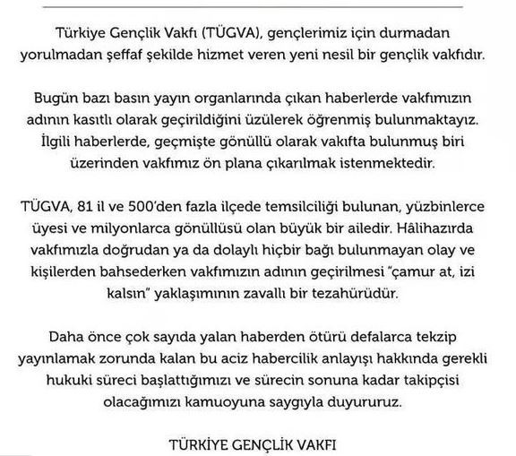 Türkiye'nin hizmetinde olan kurum ve kuruluşları hedef alarak kamuoyu önünde damgalamak isteyen Cumhuriyet gazetesi, yaptığı yüzlerce yalan haberine tekzip yayınlamak zorunda kalmıştı. TÜGVA'nın gençliğe yönelik yaptığı yatırımlar, halk nezdinde büyük takdir topluyor. Kurumu yıpratmak için baştan sona kurgulanan habere karşı TÜGVA önemli bir adım attı. Gazetenin bu skandal haberine karşı hukuki süreci başlatan TÜGVA yazılı bir açıklama yaparak, doğru bilgileri kamuoyuyla paylaştı.