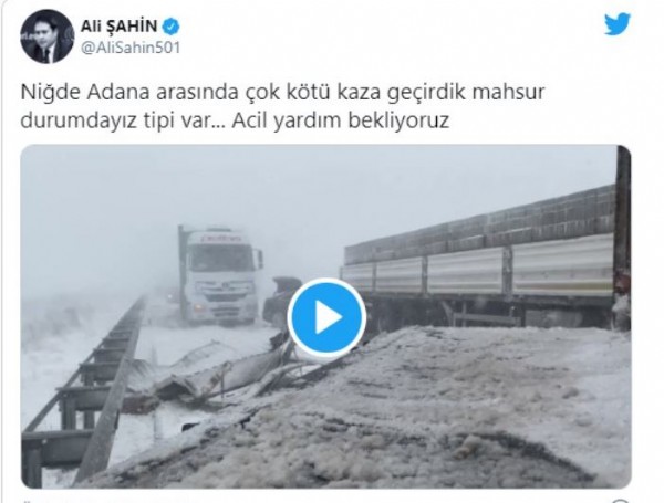 Bir tıra arkadan çarpan aracının görüntüsünü paylaşan Şahin, 'Niğde Adana arasında çok kötü kaza geçirdik, mahsur durumdayız, tipi var. Acil yardım bekliyoruz.' ifadelerini kullandı.