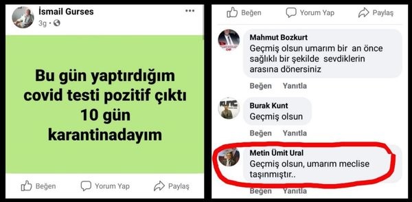 Metin Ümit Ünal'ın; 7 Nisan 2021 tarihinde koronaya yakalandığını açıklayan CHP'li CHP İl Genel Meclisi Üyesi İsmail Gürses paylaşımının altına 'Geçmiş olsun. Umarım Meclis'e taşınmıştır' ifadelerini kullandığı öğrenildi.