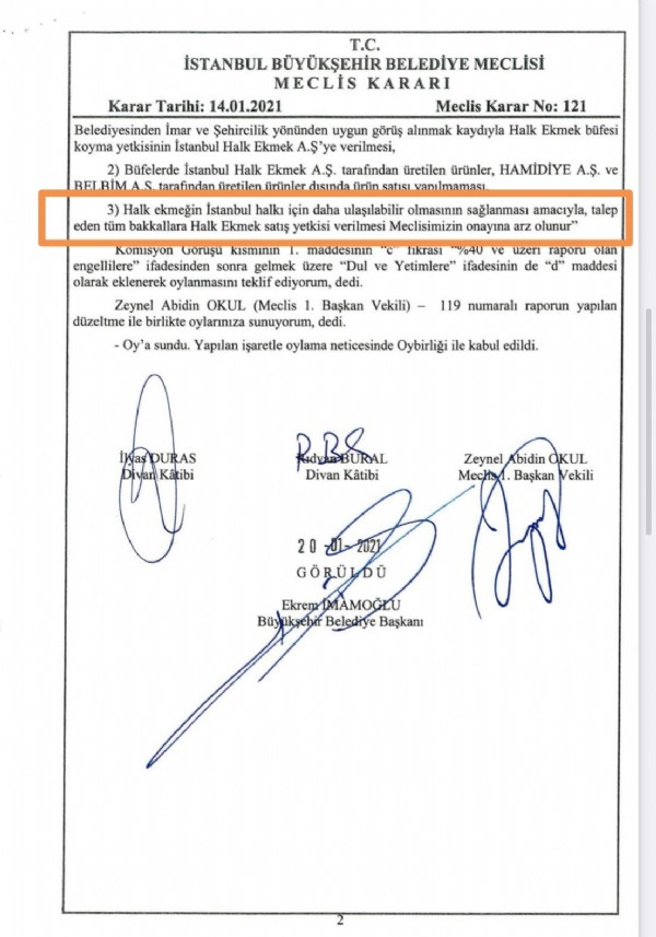 "Ha, mesele eğer Halk Ekmek ise mesele eğer fakirin ekmeğe daha hızlı bir şekilde ulaşmasıysa bakın aynı Meclis kararında bir şey daha önerdik; İstanbul'da her sokakta bakkal var hem esnafımız, hem halkımız kazansın. Hem de halkımız yürüme mesafesi gitsin Halk Ekmek'e ulaşsın. Eğer yüreğiniz yetiyorsa, eğer meseleniz ekmeğin insanımıza ulaşmasıysa buyurun. Bütün bakkallar sizi bekliyor. Bütün bakkallar tezgahlarını açtı Halk Ekmek'i bekliyor ve Halk Ekmek'i kendi tezgahlarında vatandaşlarımızla buluşturmayı bekliyor. Biz AK Parti olarak Halk Ekmek'e bunun iznini verdik. Eğer gerekiyorsa daha ayrıntılı bir şekilde mayıs ayında anlayabilmeniz için ayrıntılı bir kararla Halk Ekmek'in ürettiği ekmeğin vatandaşımıza en hızlı şekilde ulaşması için bütün bakkallara dağıtılması ile ilgili gerekli çalışmaları da başlatacağımızı da bütün İstanbulluların huzurunda ifade etmek istiyorum."