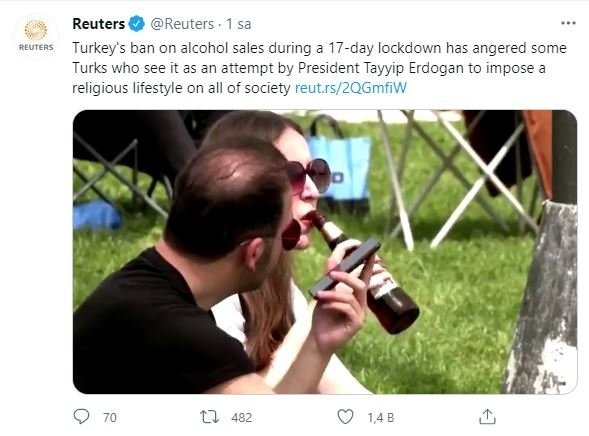 Londra merkezli uluslararası ajans Reuters haberde, "Türk hükümetinin 17 günlük Kovid-19 kapanması sırasında alkol satışını yasaklaması, Başkan Recep Tayyip Erdoğan'ın dindar yaşam tarzını toplumun tüm kesimlerine dayatması olarak gören bazı seküler Türkleri kızdırdı" ifadelerini kullandı.
