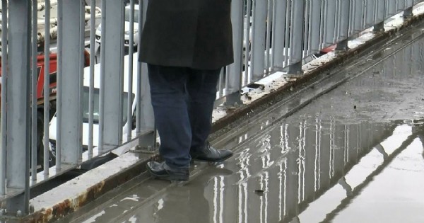 Suya ve çamura girmeden yürümek isteyenler, üst geçidin korkuluklarına tutunarak karşıya geçmeye çalıştı.