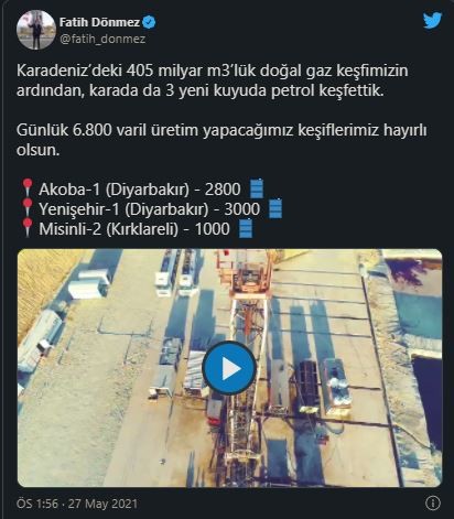 'Karadeniz'deki 405 milyar m3'lük doğal gaz keşfimizin ardından, karada da 3 yeni kuyuda petrol keşfettik. Günlük 6.800 varil üretim yapacağımız keşiflerimiz hayırlı olsun' diyen Dönmez, şu bilgileri verdi: