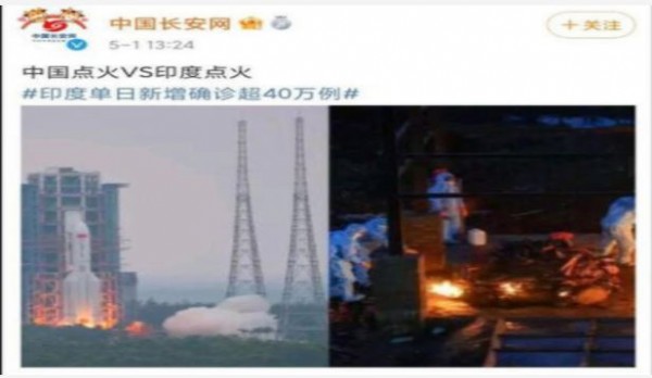 Çin'in sosyal medya sitesi Weibo'da yapılan paylaşımda, Çin'de fırlatılan bir roket ile Hindistan'da koronavirüs nedeniyle hayatını kaybeden kişilerin parklarda yakıldığı fotoğraf yan yana koyularak 'Çin'de yakılan ateş ile Hindistan'da yakılan ateş arasındaki fark' yazılmıştı.