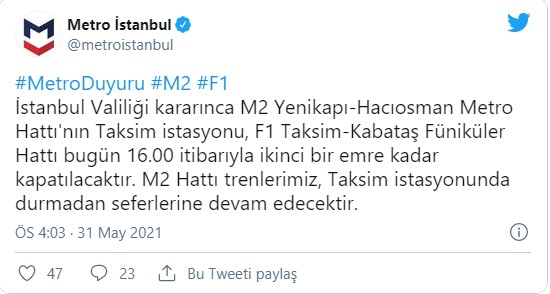 Metro İstanbul, İstanbul Valiliği kararınca Yenikapı-Hacıosman Metro Hattı'nın Taksim istasyonu ile Taksim-Kabataş Füniküler Hattı'nın kapatıldığını duyurdu.