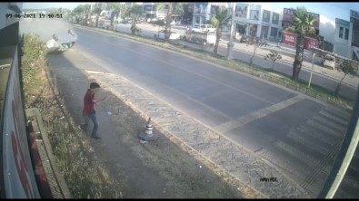 Otomobilin yayaya çarpmamak için manevra yapip taklalar attigi anlar ve o esnada kaldirimda yürüyen yayanin üzerine gelen otomobilden kaçtigi anlar, güvenlik kamerasina saniye saniye yansidi.