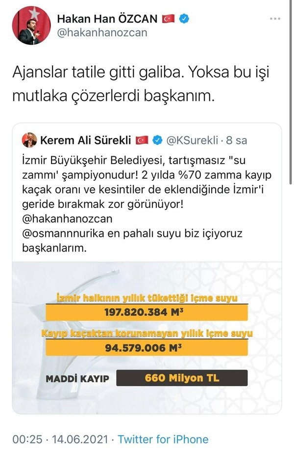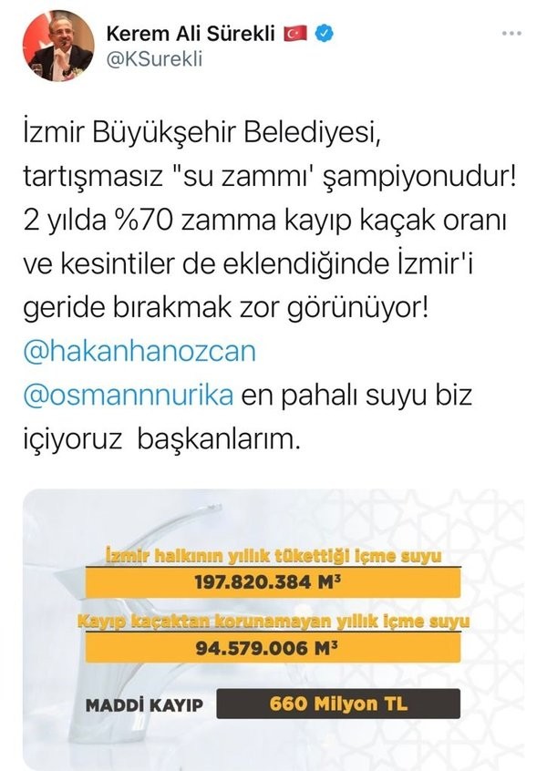 Kerem Ali Sürekli de, 'İzmir Büyükşehir Belediyesi, tartışmasız 'su zammı' şampiyonudur! 2 yılda yüzde 70 zamma kayıp kaçak oranı ve kesintiler de eklendiğinde İzmir'i geride bırakmak zor görünüyor! En pahalı suyu biz içiyoruz' ifadelerini kullandı.
