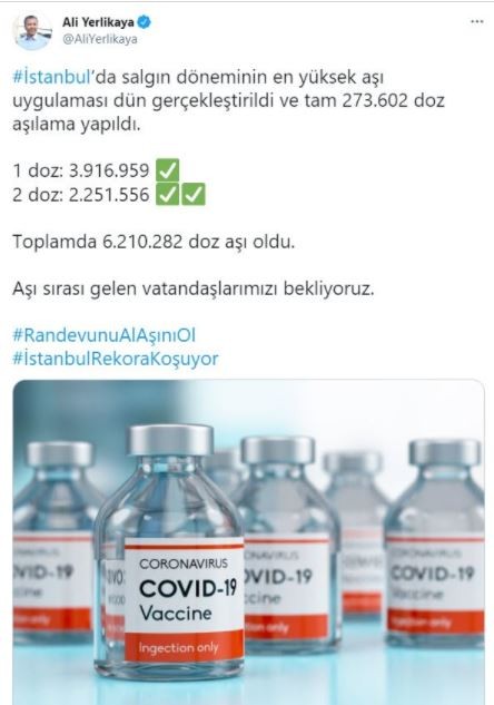 Vali Yerlikaya'nın açıklamasında, 'İstanbul'da salgın döneminin en yüksek aşı uygulaması dün gerçekleştirildi ve tam 273.602 doz aşılama yapıldı.