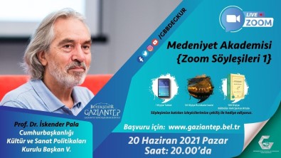 Gaziantep Büyüksehir Belediyesi tarafindan düzenlenen Medeniyet Söylesileri pandemi sartlari nedeni ile “Medeniyet Akademisi Zoom Söylesileri” olarak devam ediyor. Düzenlenecek söylesinin ilk konugu Cumhurbaskanligi Kültür ve Sanat Politikalari Kurulu Baskan Vekili Prof. Dr. Iskender Pala olacak.