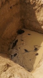cep telefonu ile görüntülendi. Görüntülerde su dolu çukurda bulunan birçok domuzun boguldugu, birkaç domuzun da çukurdan kurtulma çabalari yer aliyor.