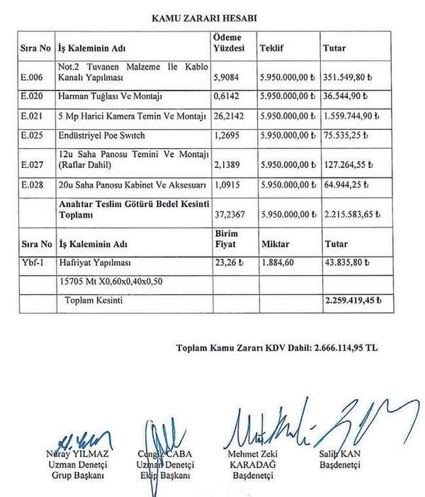 Bu eksiklikleri tek tek sayan ve yine kamunun uğradığı zararı kalem kalem hesaplayan Sayıştay denetçileri, 5 milyon 950 bin liralık ihalede 2 milyon 666 bin lira kamu zararı oluştuğunu rapor etti. Sadece 5 Mp harici kamera temin ve montajındaki eksiklikler nedeniyle kamunun zararının 1 milyon 559 bin lira olduğu vurgulandı.Teknik şartnamede kameralarda 64 GB SD kart bulunması gerektiği açıkça belirtiliyor. Ancak işte kullanılan kameralarda 4 GB SD hafıza kartı olduğu belirlendi.