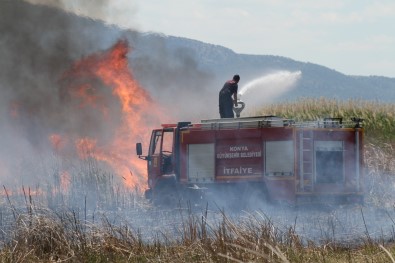 Yangin, Beysehir ilçesi Sogla mevkisindeki sazlik alanda meydana geldi. Edinilen bilgiye göre, göl kenarinda çok sayida büyük ve küçükbas hayvanin da otlatildigi ve kazlarin beslendigi sazlik alanda henüz bilinmeyen bir nedenle yangin çikti.