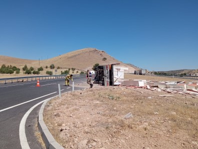 Mardin istikametine dogru seyir halinde olan büro dolaplari yüklü olan 16 AIL 250 plakali tir, kirsal Yesilköy Mahallesi mevkisinde ön lastikleri patladi. Kontrolden çikan tir, refüje çarparak devrildi. Kazada sürücü hafif yaralanirken tir ve dorsesinde bulunan mobilyalar hasar gördü. Haber verilmesiyle, olay yerine 112 acil saglik, itfaiye ve