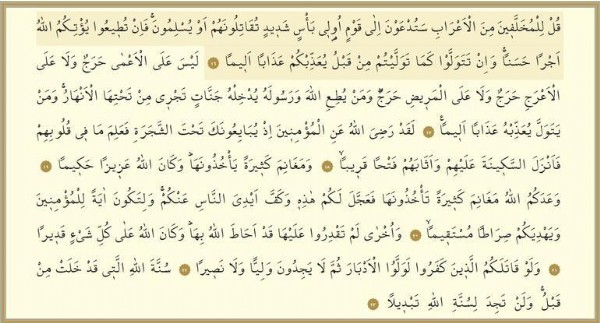 Kul lil muhallefıne minel a'rabi se tüd'avne ila kavmin ülı be'sin şedıdin tükatilunehüm ev yüslimun fe in tütıy'u yü'tikümüllahü ecran hasena ve in tetevellev kema tevelleytüm min kablü yüazzibküm azaben elıma