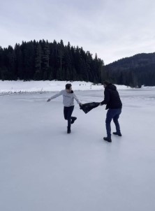 Karabük’te 4 gün aradan sonra kar yeniden yüzünü gösterdi. Yagan karin keyfini sanayi esnafi aracin arkasina bagladiklari halatla kayak yaparak çikartirken, 3 kafadar arkadas ise donan gölün üzerinde tehlikeye aldiris etmeden kaydi.