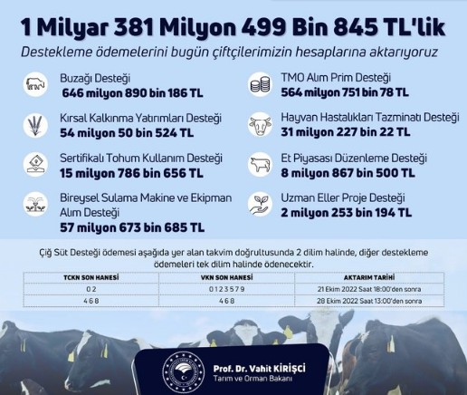 Son dakika haberi: Tarım ve Orman Bakanı Vahit Kirişci, 1 milyar 381 milyon 499 bin 845 liralık tarımsal destekleme ödemelerinin çiftçilerin hesaplarına aktarılacağını duyurdu.