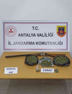 Antalya’da jandarma ekiplerinin düzenledigi operasyonda 550 gram uyusturucu, 1 adet uyusturucu hap ve 1 adet av tüfegi ele geçirildi.