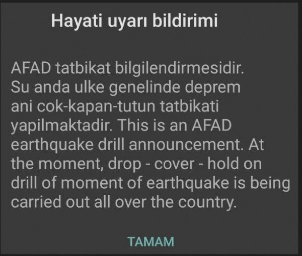 Son dakika haberi! Türkiye'nin 81 ili ve Kuzey Kıbrıs Türk Cumhuriyeti'nde 'Deprem Anı Ülke Tatbikatı' düzenleniyor. Tatbikat saat 18.57'de başladı. Tatbikat, İçişleri Bakanlığı ve AFAD tarafından 1999 Düzce Depremi'nin 23. yılı dolayısıyla planlandı. AFAD, telefonlara "Hayati Uyarı Bildirimi" başlıklı bir uyarı gönderdi.