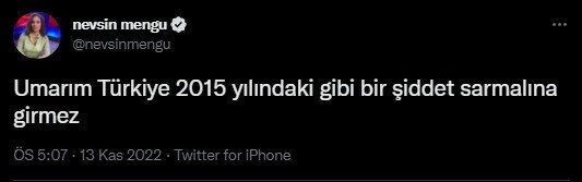 Gazeteci Nevşin Mengü Taksim patlamasının ardından önce olayı seçimle bağdaştırdı ardından olay üzerinden espiri yapmaya kalktı. Patlamadan sonra sosyal medya hesabı Twitter'dan, "Umarım Türkiye 2015 yılındaki gibi bir şiddet sarmalına girmez" ifadelerini kullanan Mengü, PKK'lı teröristin olay yerinden ayrılırken taksi kullanmasına yönelik ise, "Zanlı taksi bulabilsin diye yabancı uyruklu seçilmiş olabilir" dedi.