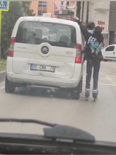 Canlarini hiçe sayan iki çocuk, paten üstünde hareket halindeki araca tutunarak dakikalarca seyahat etti.