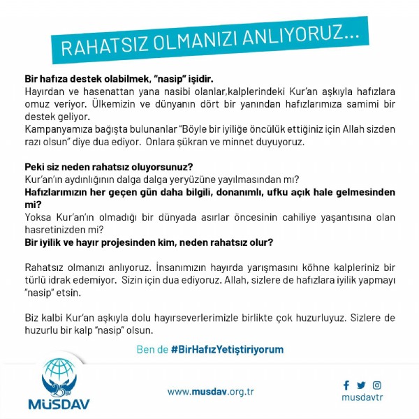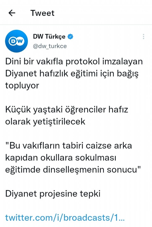 DW Türkçe, 'Dini bir vakıfla protokol imzalayan Diyanet hafızlık eğitimi için bağoş topluyor. Küçük yaştaki öğrenciler hafız olarak yetiştirelecek. 'Bu vakıfların tabiri caizse arka kapıdan okullara sokuılması eğitimde dinselleşmenin sonucu' Diyanet projesine tepki' ifadeleriyle paylaşım yaptı.