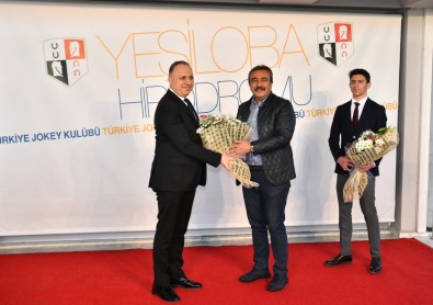 Çukurova Belediyesi Baskani Soner Çetin, at sahibi Ergutay Özyurteri’ne yaris sonrasi çiçek verdi ve kupasini takdim etti.
