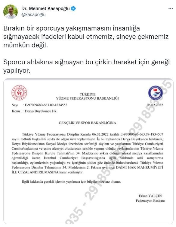 Türkiye Yüzme Federasyonu Başkanı Erkan Yalçın, Büyükuncu'nun paylaşıma sert tepki gösterdi. Yalçın, yaptığı yazılı açıklamada eski milli yüzücüye sporculuğu döneminde Erdoğan'ın büyük destek verdiğini hatırlattı.