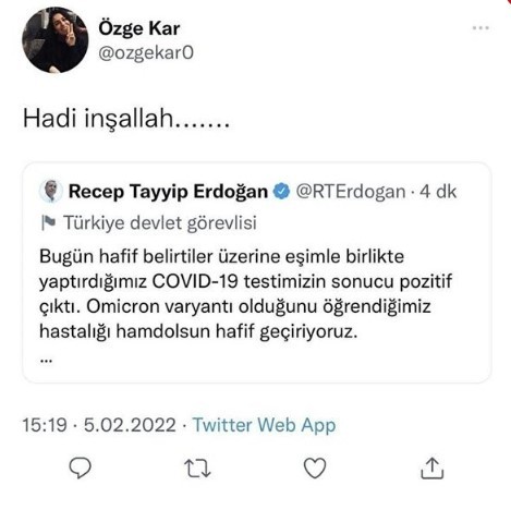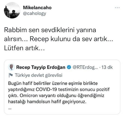 Başkan Erdoğan cumartesi günü sosyal medya hesabından yaptığı açıklamada, eşi Emine Erdoğan ve kendisinin koronavirüs testinin pozitif çıktığını duyurdu. Erdoğan 'Bugün hafif belirtiler üzerine eşimle birlikte yaptırdığımız COVID-19 testimizin sonucu pozitif çıktı. Omicron varyantı olduğunu öğrendiğimiz hastalığı hamdolsun hafif geçiriyoruz. Görevimizin başındayız. Çalışmalarımıza evde devam edeceğiz. Dualarınızı bekliyoruz' şeklinde paylaşım yapmıştı.