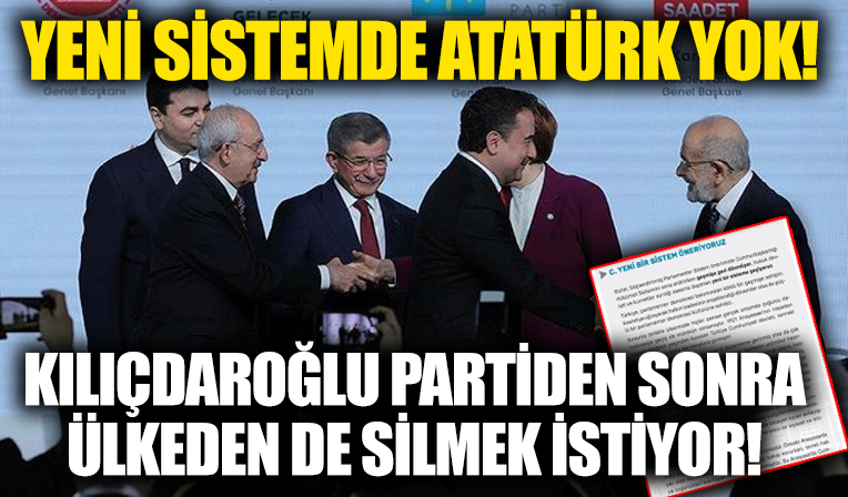 CHP lideri Kemal Kılıçdaroğlu, partisindeki Atatürkçü isimleri tasfiye ettikten sonra şimdi de Atatürk'ün ismini ülkeden tamamen silmek istiyor. 6 muhalefet liderinin “Güçlendirilmiş Parlamenter Sistem” mutabakat metninde “Atatürk” ve “Türk Milleti” adının hiç geçmemesi dikkat çekiyor.