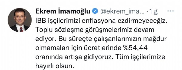 İstanbul Büyükşehir Belediyesi'nin CHP'li başkanı Ekrem İmamoğlu, tüm İBB işçilerine %54.44 zam yapıldığını açıklamıştı.