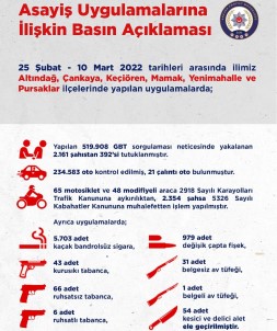 Ankara Il Emniyet Müdürlügü ekiplerince 25 Subat-10 Mart tarihleri arasinda Altindag, Çankaya, Keçiören, Mamak, Yenimahalle ve Pursaklar ilçelerinde yapilan uygulamalarda 519 bin 908 kisiye Genel Bilgi Toplama sorgulamasi yapildi. Sorgulama sonucunda süpheli görülerek yakalanan 2 bin 161 sahistan 392’si tutuklanarak cezaevine gönderildi. Ayrica uygulamalarda kontrol edilen 234 bin 583 araçtan 21’inin çalinti oldugu belirlenirken, 65 motosiklet, 48 modifiyeli araç ve 2 bin 354 sahsa Kabahatler Kanunu’na muhalefetten islem yapildi. Uygulamada 5 bin 703 adet kaçak bandrolsüz sigara, 43 adet kurusiki tabanca, 66’si ruhsatsiz 72 adet tabanca, 979 adet degisik çaplarda fisek, 31’i belgesiz 33 av tüfegi ve 54 adet kesici ve delici alet ele geçirildi.