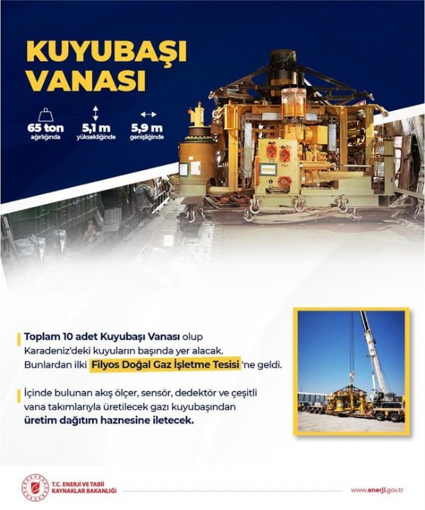 Açıklamaya göre, Türkiye'nin Karadeniz'de keşfettiği gazı, kuyuların başından üretim ve dağıtım haznesine iletmekte kullanılacak dev kuyubaşı vanalarından ilki Türkiye'ye geldi.