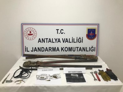 Manavgat Ilçe Jandarma Komutanligi ekipleri, Yeniköy, Aksaz, Çeltikçi, Asagiisiklar, Kizilagaç mahallerinde farkli zamanlarda meydana gelen kablo hirsizliklarinin ardindan genis çapli inceleme baslatti. Yapilan arastirmada, hirsizlik olaylarinin süphelisi olarak C.E. gözaltina alindi. Süphelinin evinde ve aracinda yapilan aramada; 2 adet demir kesme makasi, 2 adet eldiven, 1 adet kablo yakmada kullanilan demir levye, 1 adet kontrol kalemi, 2 paket halinde 8 gram kubar esrar, 1 paket halinde 5 gram metamfetamin ele geçirildi. Süpheli jandarmadaki ifadesinin ardindan adliyeye sevk edildi.