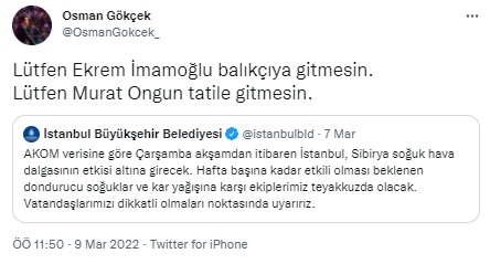 Osman Gökçek paylaşımında, 'Lütfen Ekrem İmamoğlu balıkçıya gitmesin. Lütfen Murat Ongun tatile gitmesin.' ifadelerini kullandı.