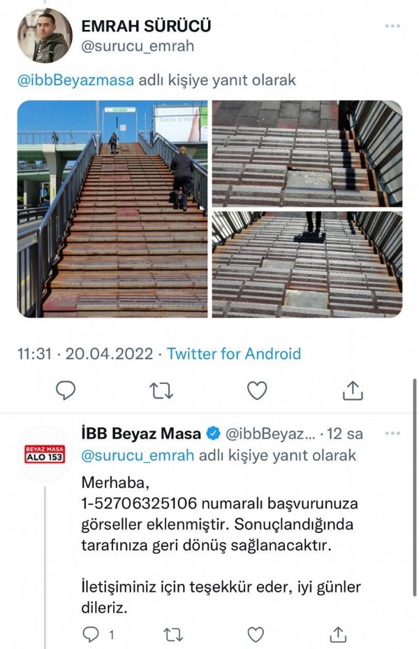 Metrobüs durağındaki merdivenlerin tadilatı için Aralık 2021'den bugüne dek şikayetlerini Beyaz Masa'ya ileten vatandaşın 5 aydır talebi alınıyor ancak tadilat yapılmıyor.