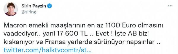 Payzın, Macron'un seçim vaadi olarak emeklilere 1100 euro maaş vereceğini söylemesine vurgu yaparak, bu rakamı Türk Lirası'na çevirdi. Fransa'daki enflasyon artışını hesaba katmayan Payzın, Twitter hesabından yaptığı paylaşımda 'Macron emekli maaşlarının en az 1100 Euro olmasını vaadediyor.. yani 17 600 TL .. Evet ! İşte AB bizi kıskanıyor ve Fransa yerlerde sürünüyor napsınlar' dedi.