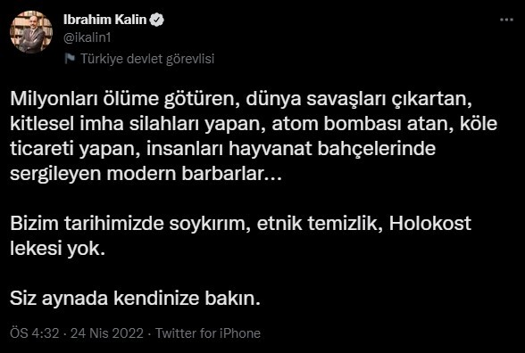 Son olarak Cumhurbaşkanlığı Sözcüsü İbrahim Kalın sosyal medyadan yaptığı açıklamada şu ifadeleri kullandı: 'Milyonları ölüme götüren, dünya savaşları çıkartan, kitlesel imha silahları yapan, atom bombası atan, köle ticareti yapan, insanları hayvanat bahçelerinde sergileyen modern barbarlar... Bizim tarihimizde soykırım, etnik temizlik, Holokost lekesi yok. Siz aynada kendinize bakın.'