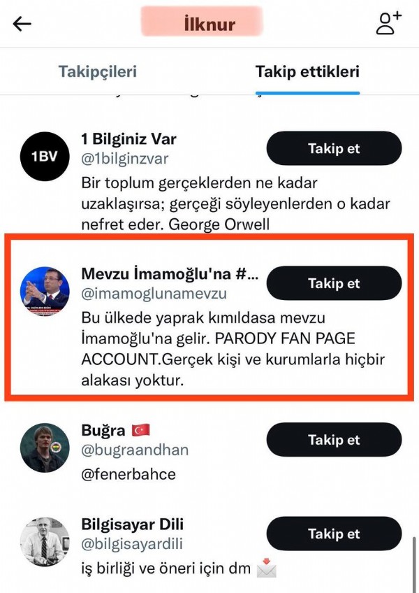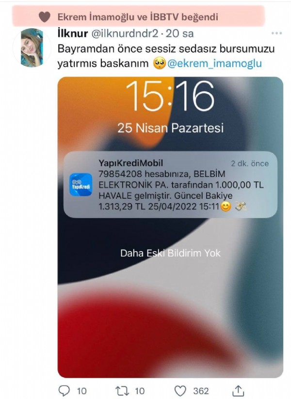 Sosyal medya hesabından 'Bayramdan önce sessiz sedası bursumuzu yatırmış başkanım' ifadesiyle İmamoğlu'nu etiketleyen genç kızın İmamoğlu ile çekilmiş bir görüntüsü ortaya çıktı. İmamoğlu'nun PR ekibinde yer alan İlknur isimli genç kızın takip ettiği tek fake hesabın 'Mevzu İmamoğlu'na' isimli hesap olduğu görüldü.