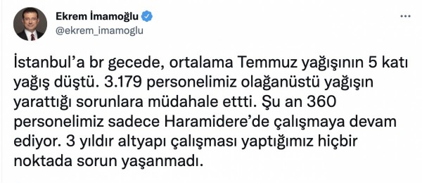 “İstanbul'a bir gecede, ortalama Temmuz yağışının 5 katı yağış düştü. 3 bin 179 personelimiz olağanüstü yağışın yarattığı sorunlara müdahale etti. Şu an 360 personelimiz sadece Haramidere'de çalışmaya devam ediyor. 3 yıldır altyapı çalışması yaptığımız hiçbir noktada sorun yaşanmadı.”