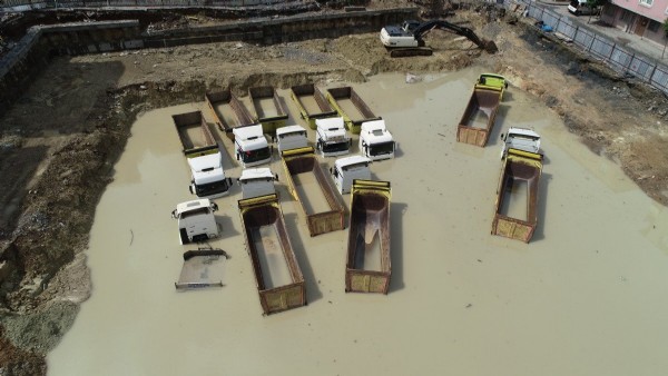 Bayram tatili nedeniyle şantiye alanına bırakılan 11 hafriyat kamyonu ve 4 iş makinesi de tamamen yağmur suyu altında kaldı.