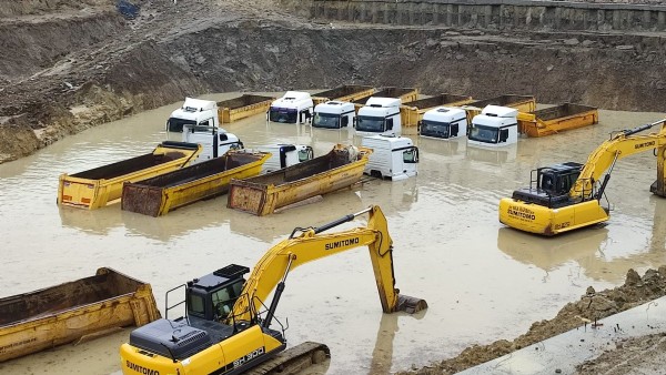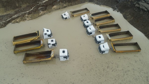 11 hafriyat kamyonu ve 4 iş makinesi suya gömüldü