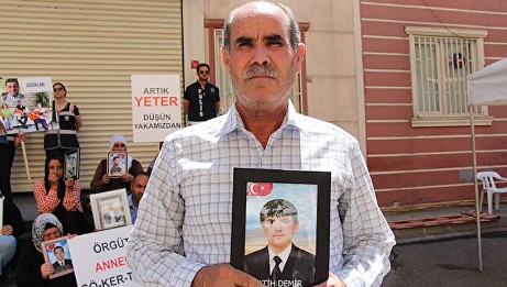 Diyarbakır'da, 2015 yılında 16 yaşındayken terör örgütü PKK tarafından kaçırılan oğlu Fatih için HDP binası önünde evlat nöbetini sürdüren Abdullah Demir, “Bugün 40 derece sıcaklığın altındayız. Evlat acısı olmasa 40 derece sıcaklıkta kimse bekleyebilir mi? Yaz, kış, hastalık dinlemeden evlatlarımızın peşindeyiz” dedi.