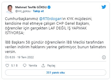 Göksu, Cumhurbaşkanı Recep Tayyip Erdoğan'ın KYK ile ilgili öğrencilere verdiği müjdeye yönelik paylaşımlarda bulanan CHP Genel Başkanı Kemal Kılıçdaroğlu ve İBB Başkanı Ekrem İmamoğlu'na tepki paylaşımında bulundu.