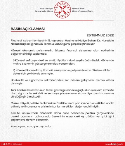 Hazine ve Maliye Bakanı Nebati Finansal İstikrar Komitesi 5’inci Toplantısı’nın gerçekleştirildiğini açıkladı. Bakan Nebati, "Ekonomik gelişmelerin, ülkemiz finansal sistemine olan etkilerini, bankacılık ve sigortacılık sektörlerindeki son dönem gelişmeler ile makro ihtiyati politika tedbirlerinin kredi piyasasına olan etkilerini kapsamlı bir şekilde ele aldık. Komitemiz, eş güdüm ve iş birliği içerisinde gerekli görülen adımları kararlılıkla atmaya devam edecektir" ifadelerini kullandı.