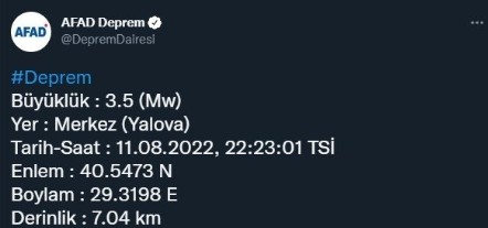 Boğaziçi Üniversitesi Kandilli Rasathanesi ve Afet ve Acil Durum Yönetimi Başkanlığı (AFAD)'ın sürekli olarak güncellediği ve kamuoyuna duyurdu son depremler listesine göre Yalova'da saat 22.23'de 3.5 şiddetinde bir son dakika depremi meydana geldi. Yerin 7.04 kilometre derinliğinde meydana gelen deprem merkez üssüne yakın illerimizde de hissedildi. Sarsıntıların ardından çevre il ve ilçelerde bulunan vatandaşlar da panik yaşadı.SON DAKİKA: YALOVA'DA DEPREM