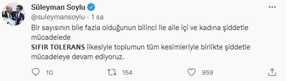 İçişleri Bakanı Süleyman Soylu, 2021'in ilk 7 ayında 166 olan kadın cinayeti sayısının, 2022 yılının ilk 7 ayında 158 olduğunu açıkladı. Bakan Soylu, sosyal medya hesabından yaptığı paylaşımda, “Bir sayısının bile fazla olduğunun bilinci ile aile içi ve kadına şiddetle mücadelede sıfır tolerans ilkesiyle toplumun tüm kesimleriyle birlikte şiddetle mücadeleye devam ediyoruz” dedi.