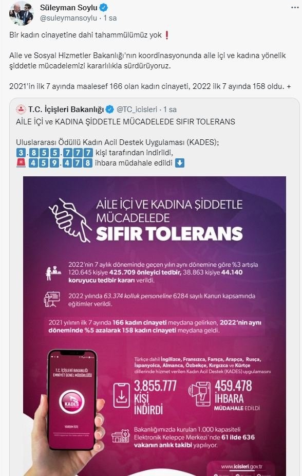 İçişleri Bakanlığının 'Aile içi ve kadına şiddetle mücadelede sıfır tolerans' başlıklı paylaşımına göre; 2022'nin 7 aylık döneminde geçen yılın aynı dönemine göre yüzde 3 artışla 120 bin 645 kişiye 425 bin 709 önleyici tedbir, 38 bin 863 kişiye 44 bin 140 koruyucu tedbir kararı verildi. 2022 yılında 63 bin 374 kolluk personeline 6284 sayılı kanun kapsamında eğitimler verildi. 2021 yılının ilk 7 ayında 166 kadın cinayeti meydana gelirken, 2022'nin aynı döneminde yüzde 5 azalarak 158 kadın cinayeti meydana geldi. Türkçe dahil İngilizce, Fransızca, Farsça, Arapça, Rusça, İspanyolca, Almanca, Özbekçe, Kırgızca ve Kürtçe dillerinde hizmet verilen KADES uygulamasını 3 milyon 855 bin 777 kişi indirdi. 459 bin 478 ihbara müdahale edildi.