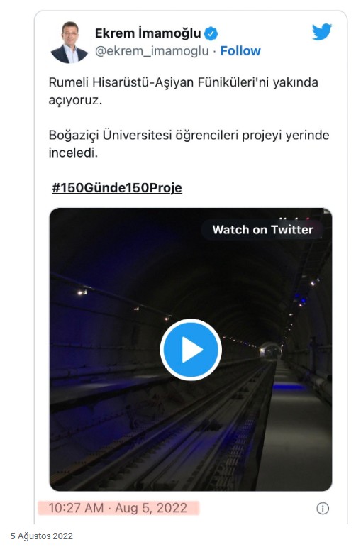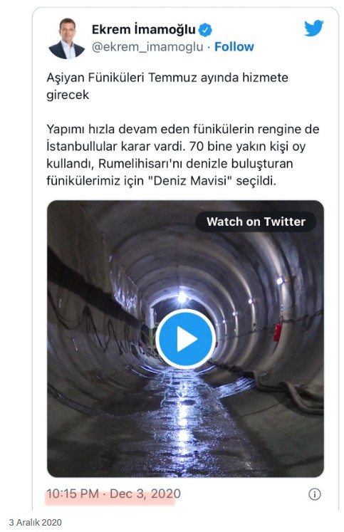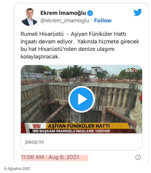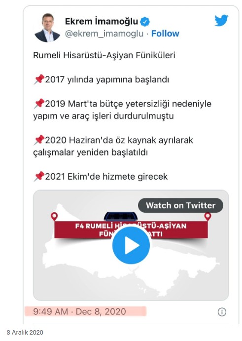 Bu tweet'ten 5 gün sonra Ekrem İmamoğlu, temmuz ayında hizmete gireceğini söylediği fünikülerin ekim 2021'de açılacağını ifade etti.